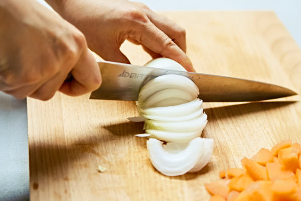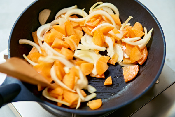 - 新にんじんは皮ごと3mm幅のいちょう切りにし、新玉ねぎは3mm厚さの薄切りにする。