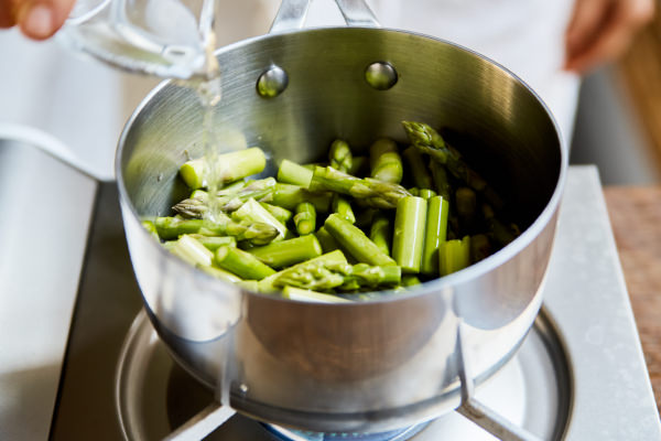 - アスパラガスは根元の固い皮を削ぎ、3~4cm長さに切る。鍋に酒、水を入れて中火にかけ、沸騰したらアスパラガスを入れ、フタをして、6~7分ほど蒸し煮にする。(POINT★1)