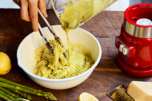 アスパラガスとレモンで作る春色ソースが爽やか! 今回は、具はなしでトッピングのみにして、アスパラガスを贅沢に使ったソースをパスタにたっぷりからめていただきます。ソースは[ガラスブレンダー リコ]を使って。ガラスジャーは耐熱だから、ゆでたてのアスパラガスも、熱々のパスタのゆで汁もそのまま入れてOK。さっと作って、温かいうちに食べて♪