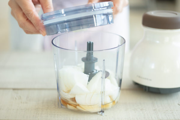 - 【新玉ねぎのたれ】を作る。新玉ねぎは3cm角に切り、全ての材料とともに[カプセルカッター キャトル]に入れ、撹拌する。(POINT★1)