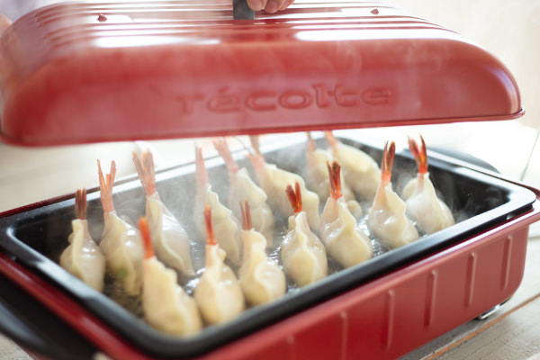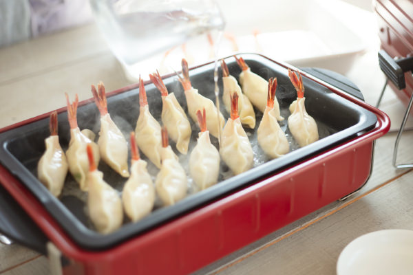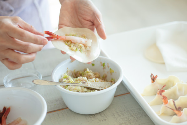 - えびの尾は餃子のはしから1.5cmくらいのところから出すと、蒸している間に見栄えよく、くるんと沿ってくれます。