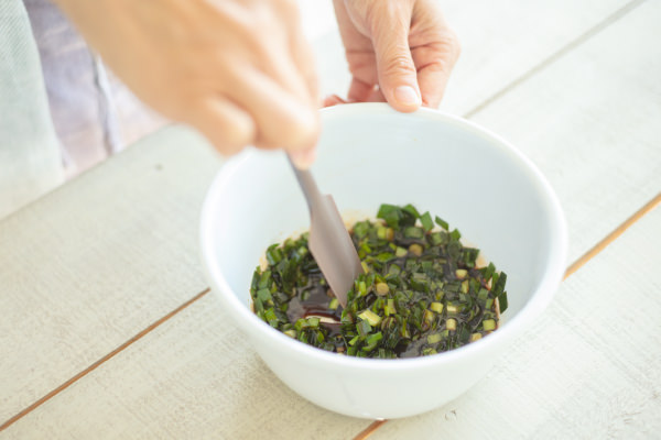 - 【にらだれ】を作る。にらは5mm幅に切り、全ての材料と混ぜ合わせる。(POINT★2)