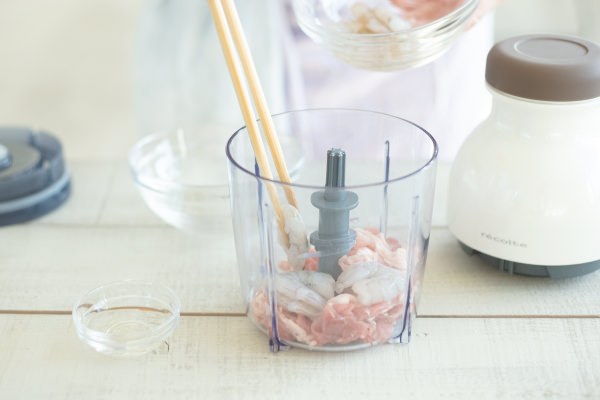 - 【餃子】を作る。【A】を[カプセルカッター キャトル]に入れ、ミンチ状になるまで撹拌する。