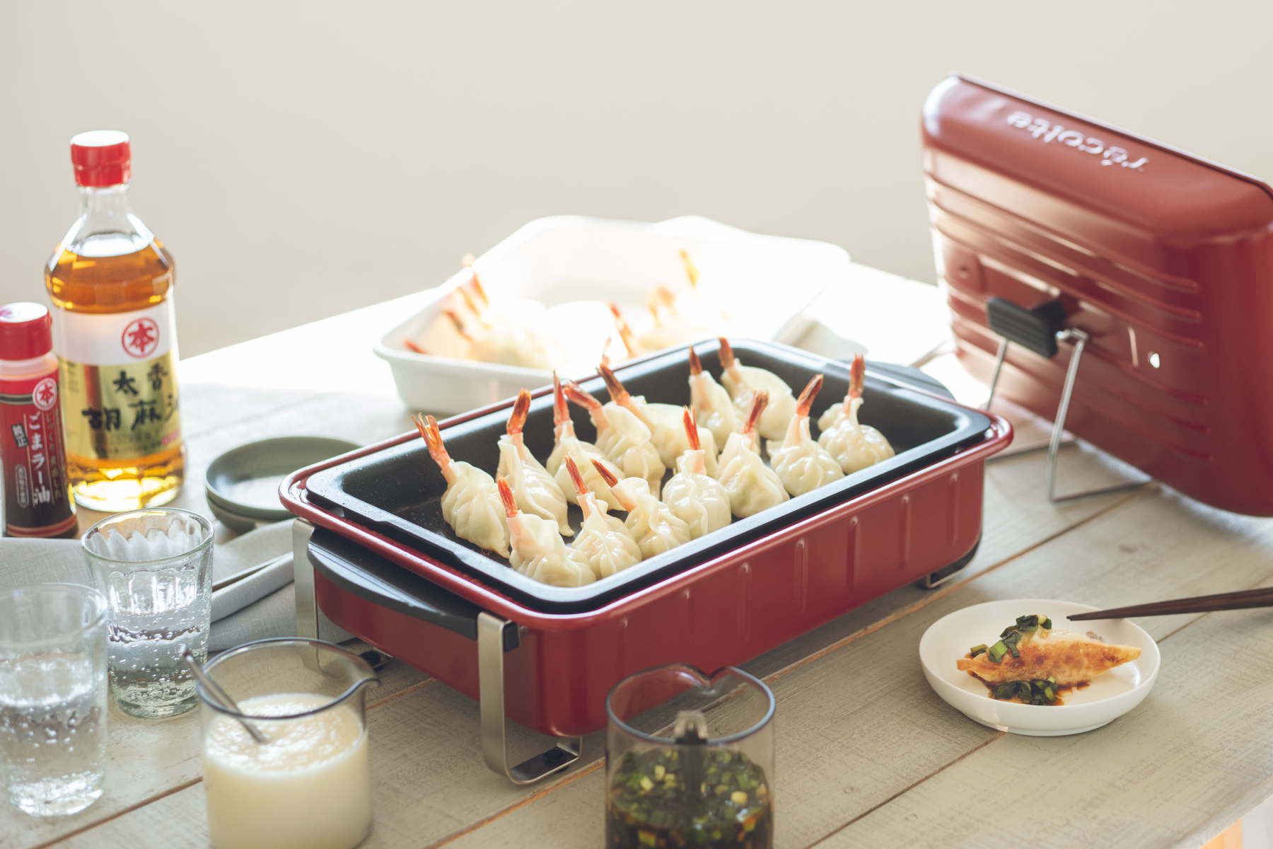 ぴょんと飛び出た甘えびの尾っぽがかわいいおしゃれ餃子。今回は、えびと豚肉をミックスしたうま味たっぷりの餃子あんに、甘くてぷりぷりの甘えびをのせて包みました。この包み方は1個あたりのあんが少なめなので火が通りやすく、ちょっとぶかっこうに包んでもおしゃれに見えるのがうれしい! たれは、マルホン 太香胡麻油をベースにした2種。新玉ねぎの優しい甘さのたれと、マルホン 純正ごまラー油のピリッとした辛さがきいたにらだれ。ごま油のおいしさで、無限に食べられる絶品餃子です!
