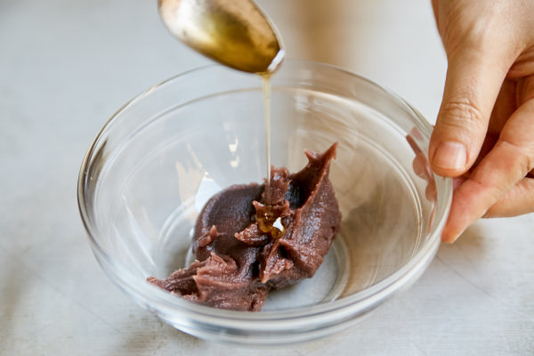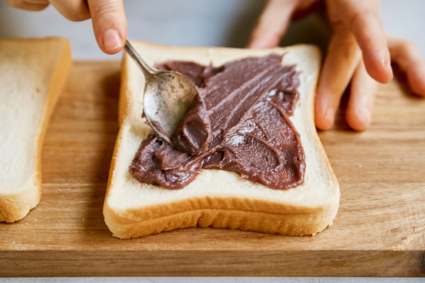 - 食パン2枚に室温に戻したバターを薄めに塗り、さらに①を塗る。こしあんは食パンの対角線上に厚めにのせ、全体に広げていく。