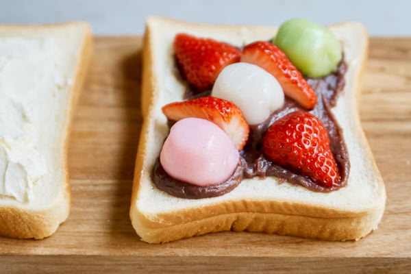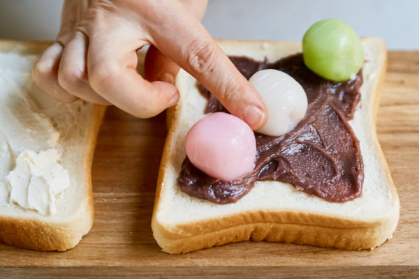 - ②のこしあんを塗った食パンに、3色だんご1本分を串から外してのせる。