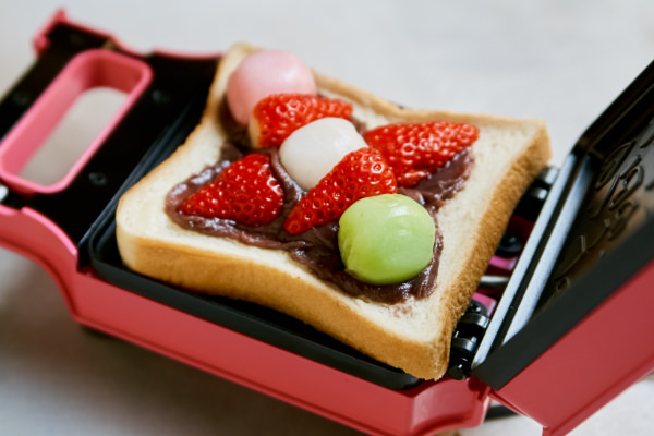 好きなものを全部入れたらこうなった! みたいなホットサンド。3色だんごがどーんと入った断面が新鮮! 味のベースは、あんことマスカルポーネチーズ。あんにはごま油を少し加えているので、ほんのり中華まん風味です。あんの優しい甘さ、チーズの濃厚な味わい、だんごのもちっと感にフレッシュいちごの爽やかさ。このホットサンドはまさに幸せな味のせめぎ合い。[プレスサンドメーカー キルト]の[リミテッドハート]で焼いたら見た目もスイート♡ “花よりだんご”なホットサンドです。