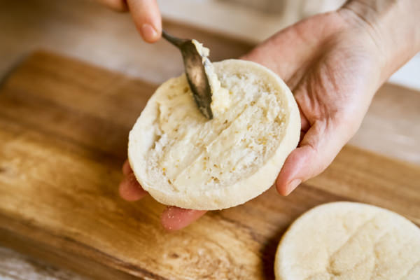 - イングリッシュマフィンを横半分に切り、それぞれに①を塗る。