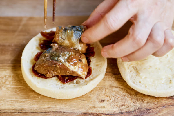 - サバ味噌煮の汁気をきり、骨にそって、マフィンにのせやすい大 きさに割る。半量ずつを③にのせる。