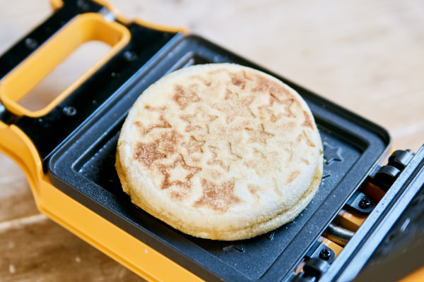 - [プレスサンドメーカー キルト]の電源を入れ、予熱を開始する。ランプが消えて予熱が完了したら、⑤の具をのせたほうのイングリッシュマフィン1枚をセットする。