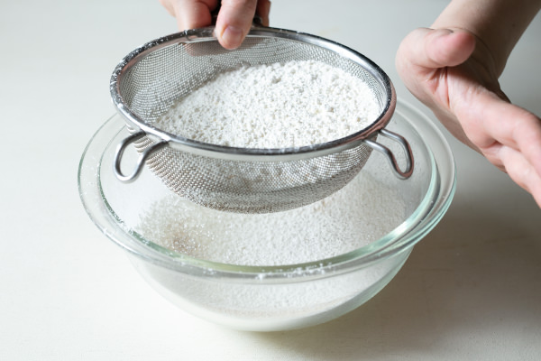 - 強力粉、薄力粉、ベーキングパウダーを合わせ、ボウルにふるい入れる。