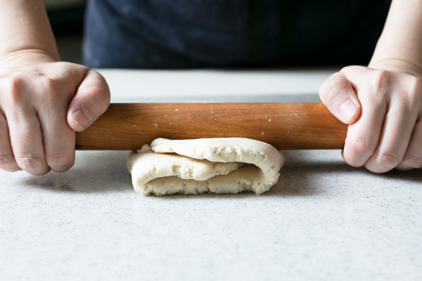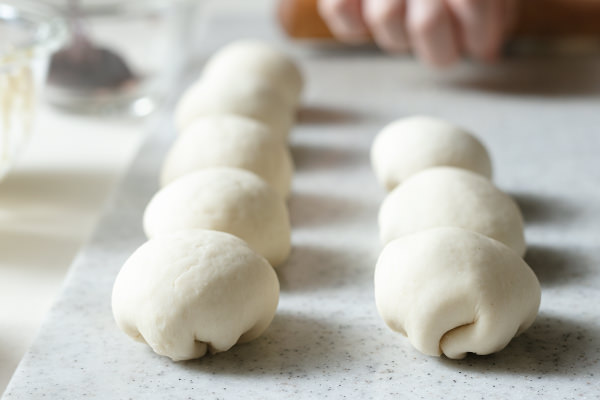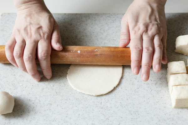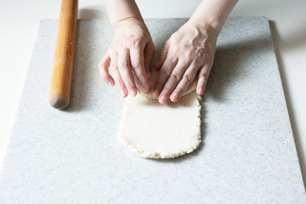 - 切り分けた一つを手にとり、切り口の断面に打ち粉(分量外)をする。手で丸く整えたら上から押さえてつぶし、中心が厚くなるように、めん棒を使って生地を回しながら、直径9cm程度の円形に伸ばす。