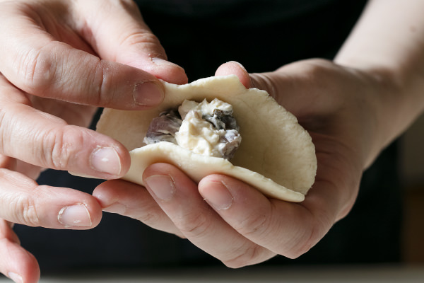 - 生地の閉じ目を下にして置く。残りの生地も同様にして伸ばし、あんを包む(POINT★2)。