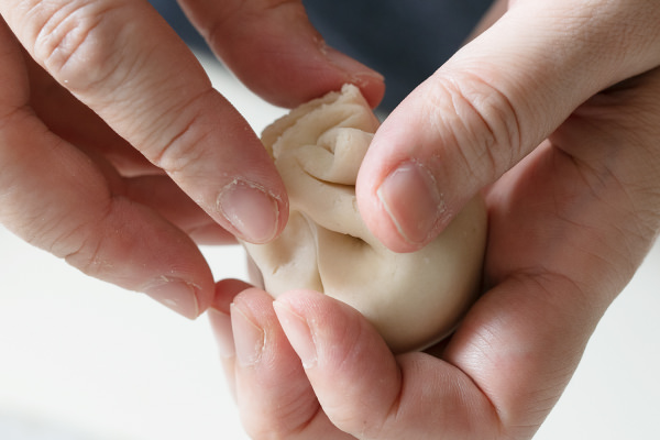 - 生地の端を中央で合わせてつまみ、ねじるようにして閉じる。