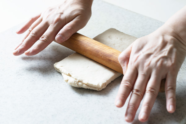 - 平らな場所に生地を置き、めん棒で1cm 厚さの長方形に伸ばす(POINT★1)。