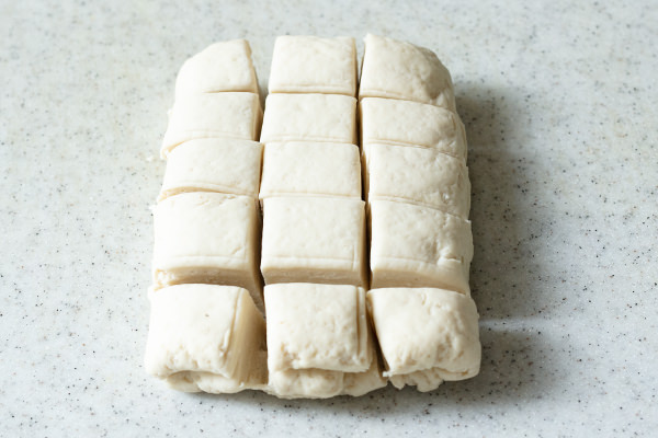 - ラップをはずしたら生地を縦長に置き、カードなどを使って、縦に3等分、横に5等分に切り分ける。