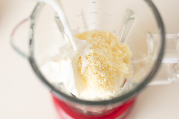 - ソースを作る。[ガラスブレンダー リコ]のガラスジャーにクリームチーズ、粉チーズ、牛乳を入れる(POINT★1)。