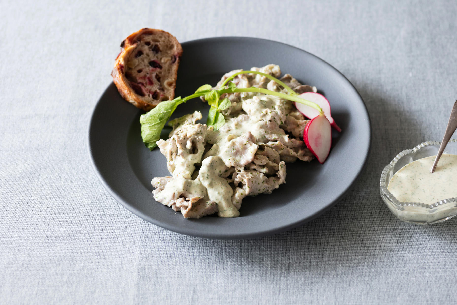 - 豚肉をボウルに入れ、肉が熱いうちに豚肉1 人分200g に対し、⑤のソース大さじ3~4 程度をかけて和える(POINT★6)。塩、こしょうで味を調えたら器に盛る。好みで薄切りにしたラディッシュやバゲットを添える。