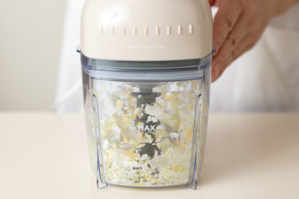 - 長ねぎは2~3cm長さに切る。皮をむいたしょうがとともに[カプセルカッター ボンヌ]に入れ、「連続プッシュ」をしてみじん切りにする。ボウルに取り出す。
