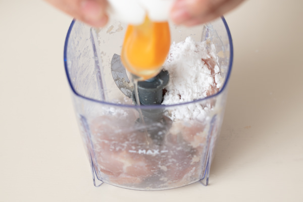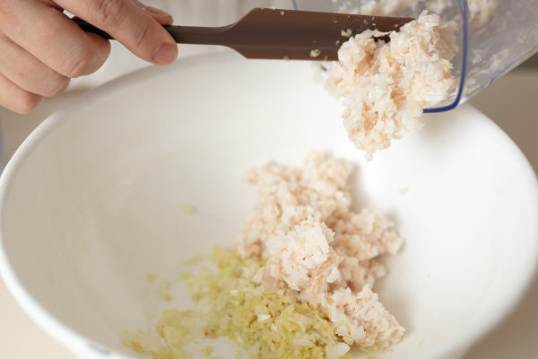 - 鶏もも肉、鶏胸肉は皮と筋を取り、ひと口大に切る。それぞれの半量を[カプセルカッター ボンヌ]に入れ、「連続プッシュ」をしてミンチ状にする。③のボウルに加える。