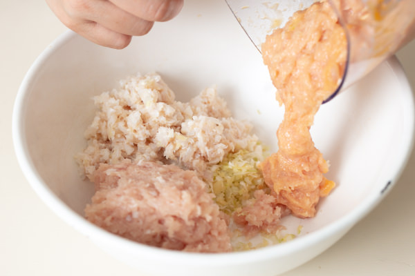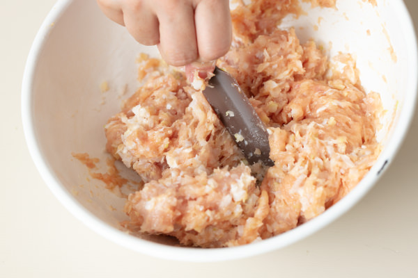 - 鶏団子のタネをへらなどで、固まらないようによく混ぜ合わせる。