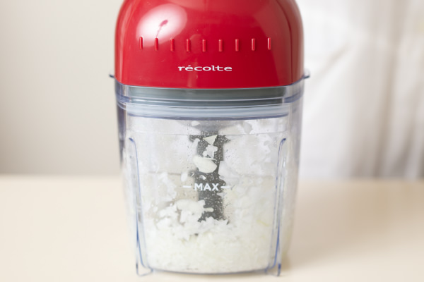 - 卵は卵黄と卵白に分ける。玉ねぎa を8~10等分に切って[カプセルカッター ボンヌ]のカップに入れ、「連続プッシュ」をして、みじん切りにする。ボウルに取り出す。