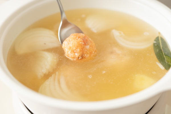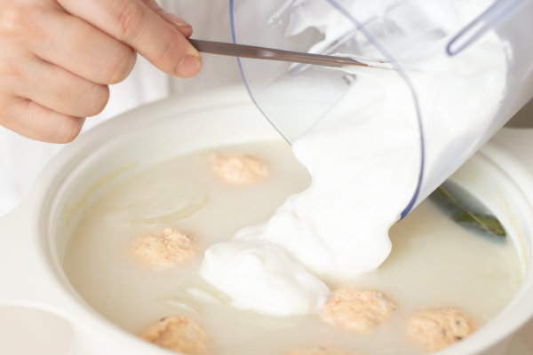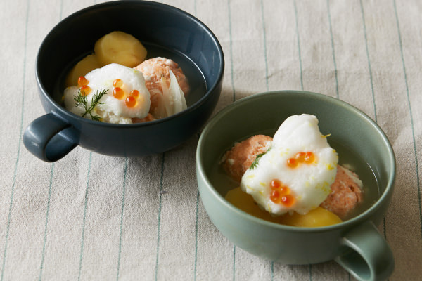 ふわっふわのメレンゲが新食感の北欧風鍋。SNSに上げたくなる見た目もさることながら、まろやかなミルクが優しく体を温めてくれる至福の味わい。口のなかでふわっと溶けるメレンゲも、[カプセルカッター ボンヌ]であっという間に作れます! ピンク色がかわいい主役のサーモンボールは大きめに作ってボリュームを出しました。今回は、北欧の魚介料理の定番、ディルといくらをトッピング。ちょっと人に自慢したくなるおしゃれ鍋です。