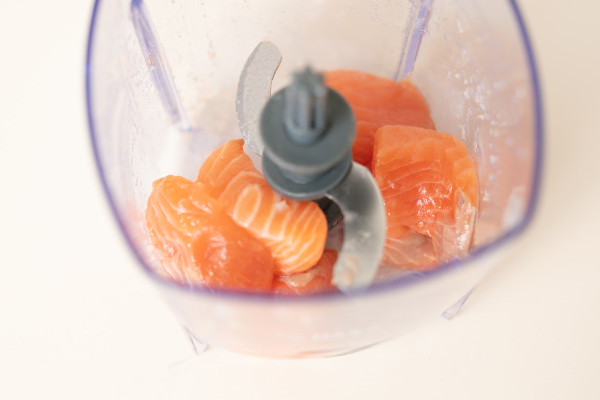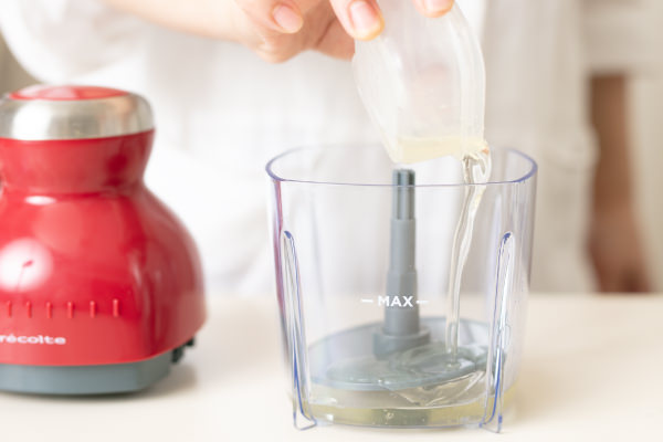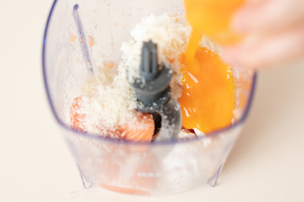 - 残りの鮭と卵黄、【A】をカップに入れ、「連続プッシュ」をして、全体がなめらかになるよう攪拌する(POINT★1)。