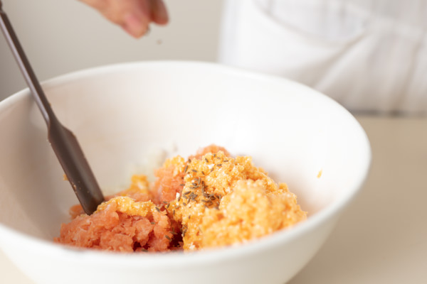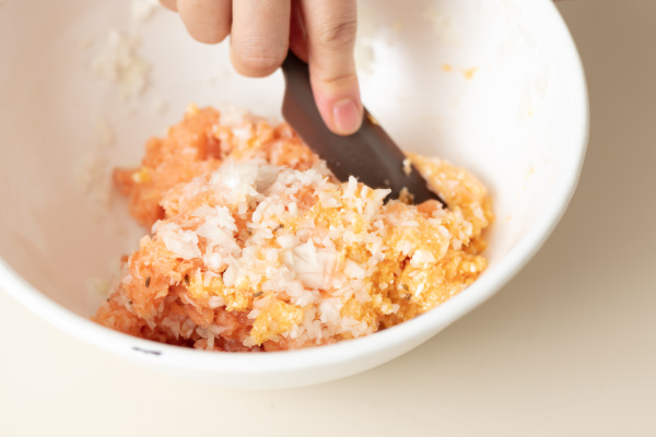 - 鮭はひと口大に切り、半量を[カプセルカッター ボンヌ]のカップに入れ、「パルスプッシュ」をして、粗めのミンチ状にする。①のボウルに加える。