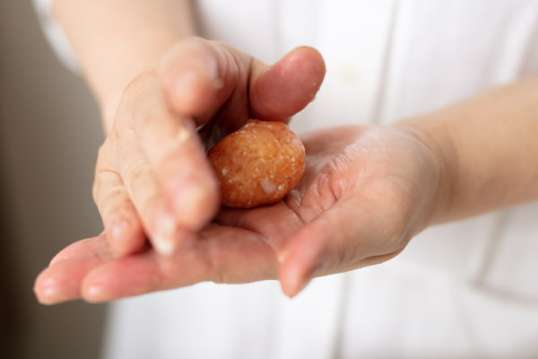 - タネを12等分にし、ボール状に丸める。このとき、手にサラダ油やオリーブオイル(分量外)などを薄く塗っておくとタネがくっつかず、作業しやすい。