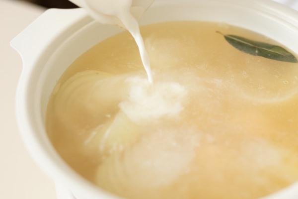 - 牛乳とバターを加える。途中でサーモンボールの上下を返し、7~8分煮込む。じゃがいもは竹串がすっと通るまで煮込む。