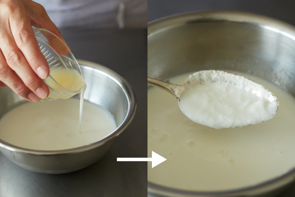 - 牛乳にレモン汁を加え、軽く混ぜる。冷蔵庫で30分おく(POINT★1)。冷やすとヨーグルト状になる。