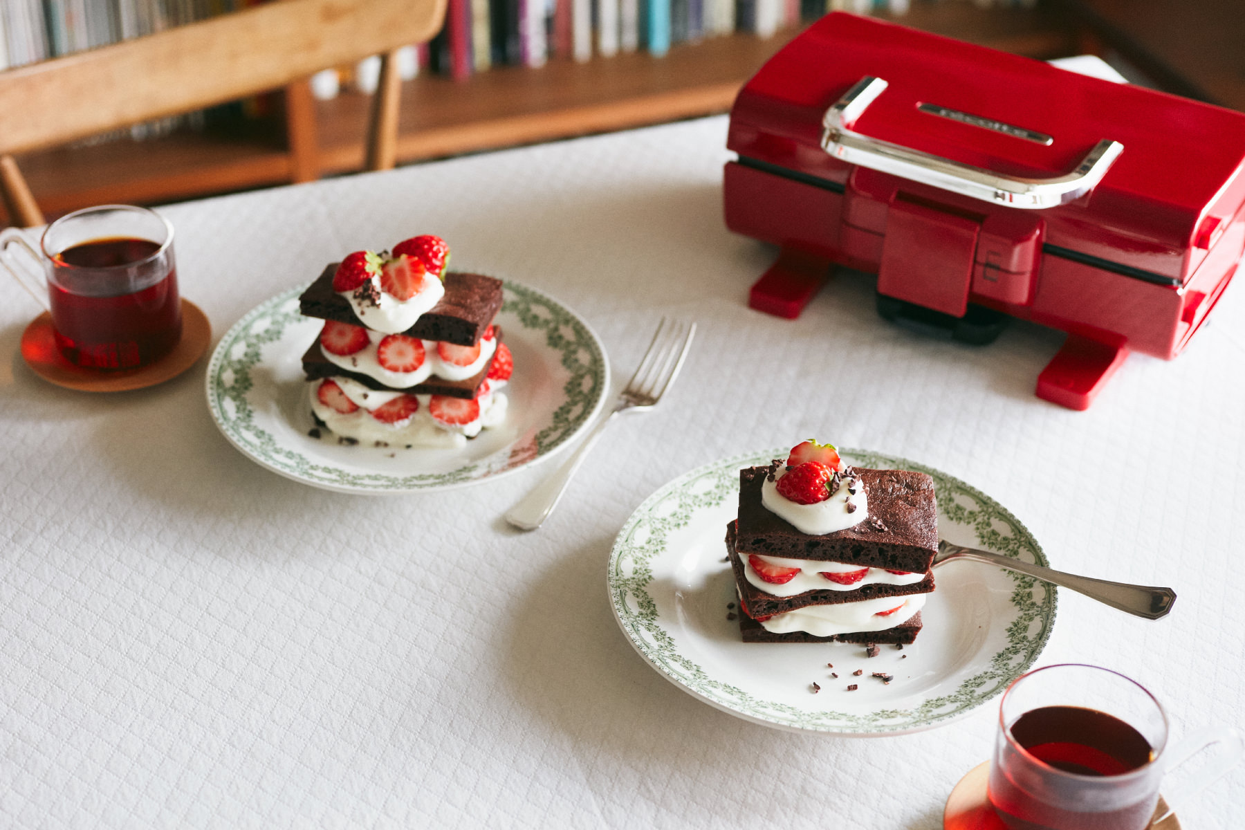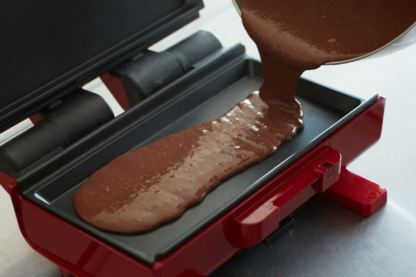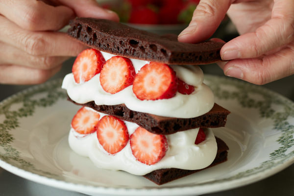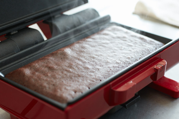 スポンジを焼いてケーキを手作りしたいけど家にオーブンがない。そんな時は[2ウェイグリル アメット]の出番です! スポンジをプレートの形に四角く焼いて、同じサイズに切り分ければ、重ねるだけで可愛いショートケーキが作れます。今回はココア風味のスポンジにして、いちごとホイップクリームをたっぷりサンドしました。見た目も可愛いのでバレンタインのケーキや、ちょっとしたおもてなしにもぴったりです!