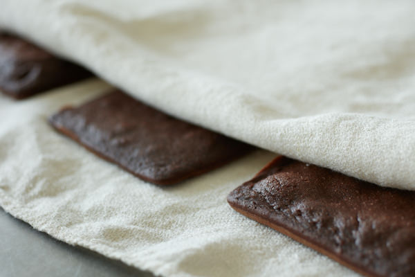 - 残りのココア生地2枚も同様に、温度調整スイッチ[H]で2分、[L]で1分、余熱で1分加熱して焼き、ふきんで包み、粗熱をとる。
