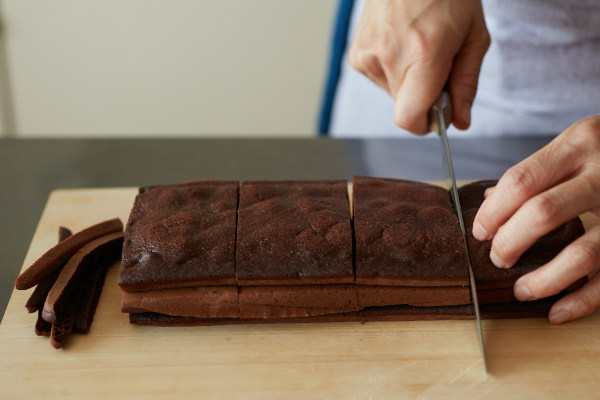 - 3枚のココア生地を重ね、両端を切り落としてそろえたら、生地を4等分に切る。
