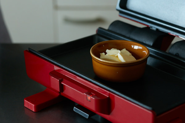- [2ウェイグリル アメット]の両面に[フラットプレート]をセットし、温度調整スイッチを[H]にする。耐熱容器にバターを入れ、本体下面のプレートに置き、バターを溶かす。