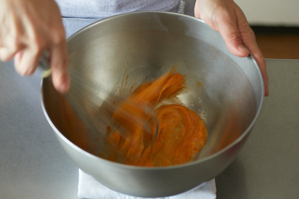 - 上白糖を加え、全体が少し白っぽくなるまで混ぜる。