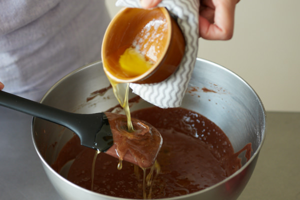 - 溶けたバターを加え、ゴムべらで混ぜ合わせる(バターが入った容器が熱くなっているので注意)。