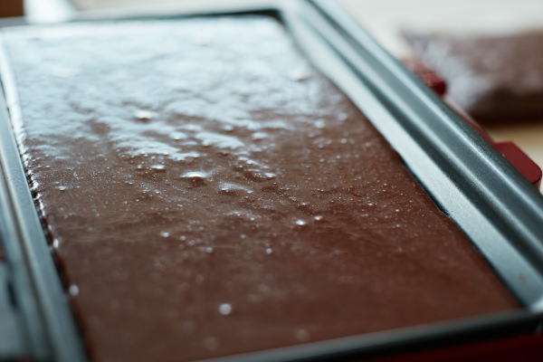- [フラットプレート]の下面に⑦のココア生地の1/3量を流し入れる。