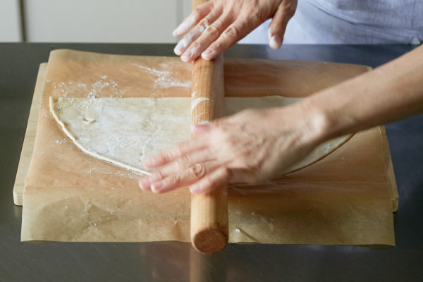 - 冷凍パイシートを半分に切ってオーブンシートの上に置き、袋の表示に従って解凍する(POINT★1)。打ち粉(分量外)をし、麺棒を数回転がすと生地がなじみやすくなる。