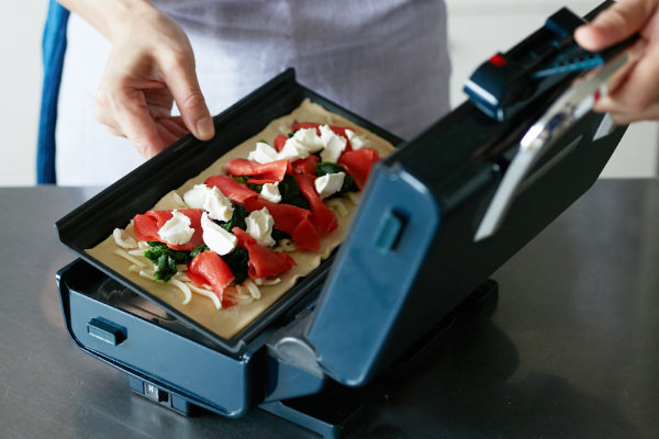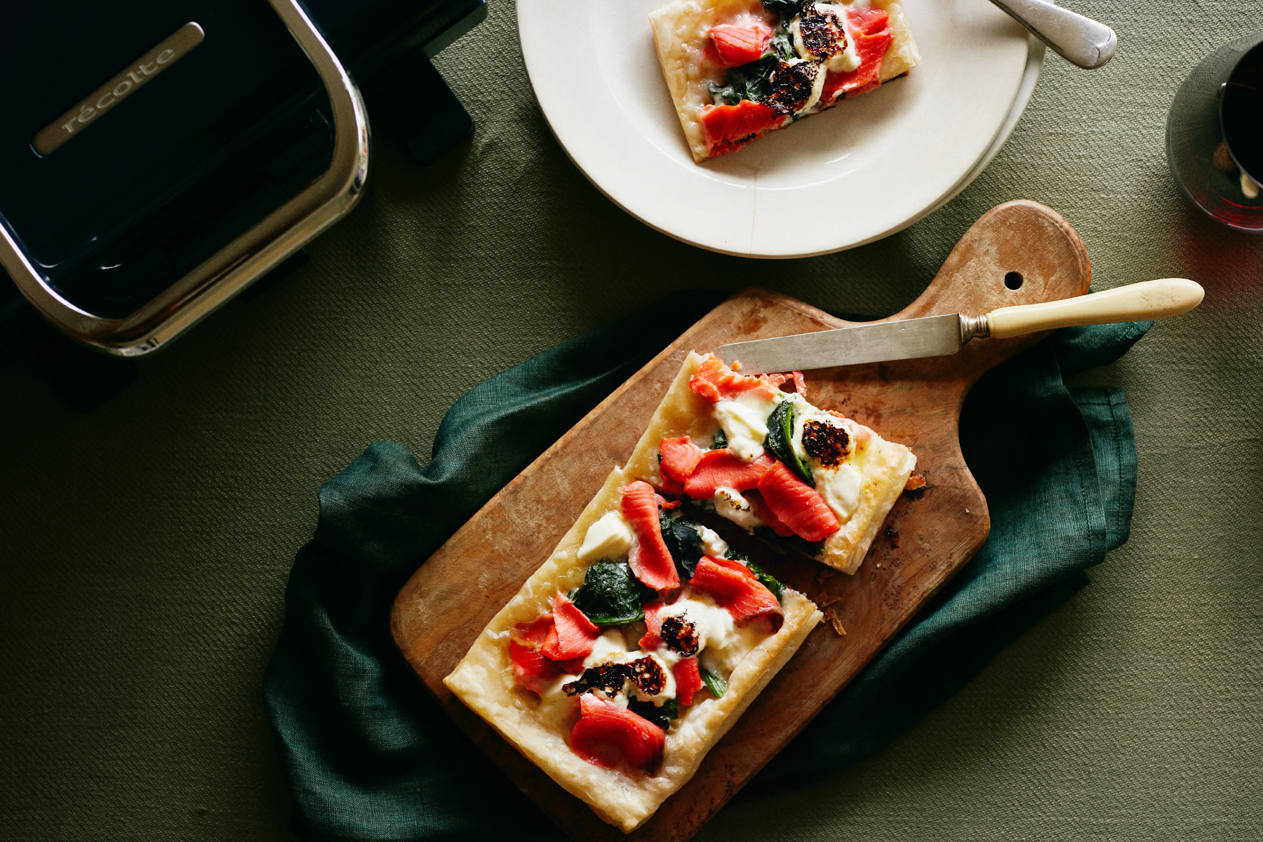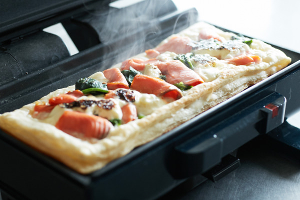 パイと聞いただけで、「なんとなく苦手…」「面倒くさいかも…」という思いがむくむく。でも[2ウェイグリル アメット]なら、冷凍パイシートをプレートにのせ、好きな具をのっけてスイッチを入れるだけ。今回は、サーモンとほうれん草、たっぷりのチーズをのせて。焼き上がりはさっくさく、とろ~りとろける濃厚チーズにやみつきです。