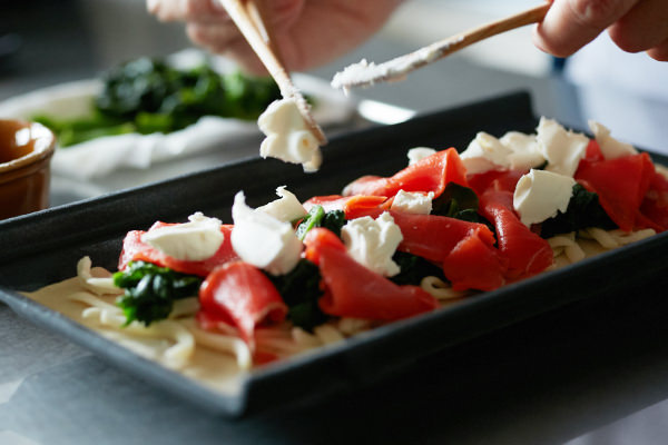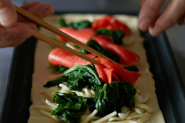 - 具を用意する。ほうれん草は下ゆでし、水分をしっかりきって2cm長さのざく切りにする。スモークサーモンは4cm長さに切る。
