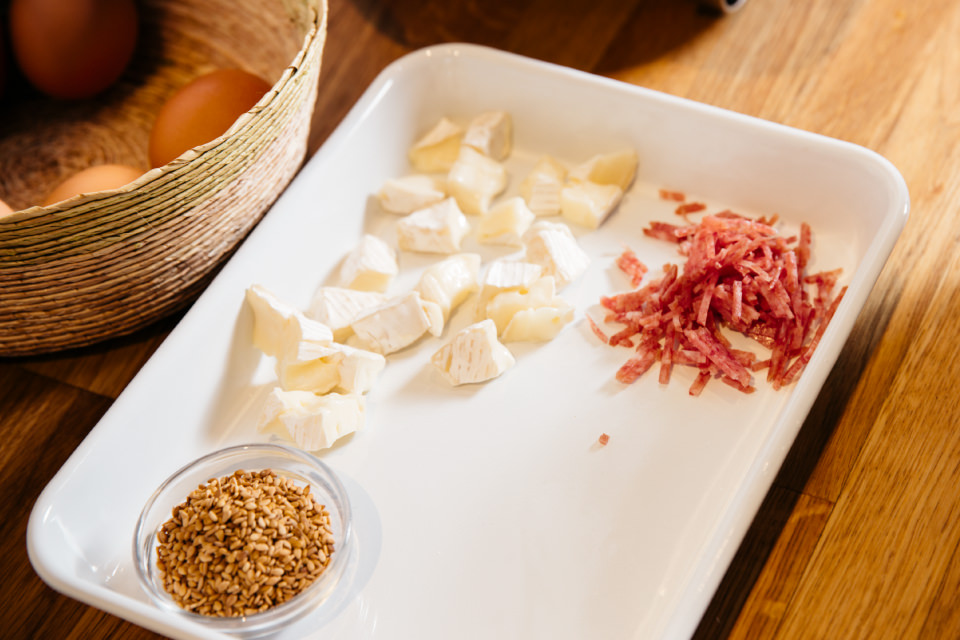 村山さんが最初に教えてくれたのは、“スナックボウル”。一口サイズで気軽につまめるフィンガーフードは気が利いているし、出しておけば宴も進んでいく、あると助かる一品! トッピングは「ごま&カマンベールチーズ」と「サラミ」の2種を教えてくれました。「このスナックボウル、[ホームバーベキュー]の[たこ焼きプレート]で作れるんです! 今回はお酒に合うように、おつまみになるものを具材に使いました。中でもサラミは、焼いている間にだしが出て、おいしくなるんですよ~」と村山さん。焼きあがったスナックボウルはもっちもち。程よい塩味でお酒が進みそうです。しかも、冷めてもおいしい。これも持ち寄りのマストポイントです。