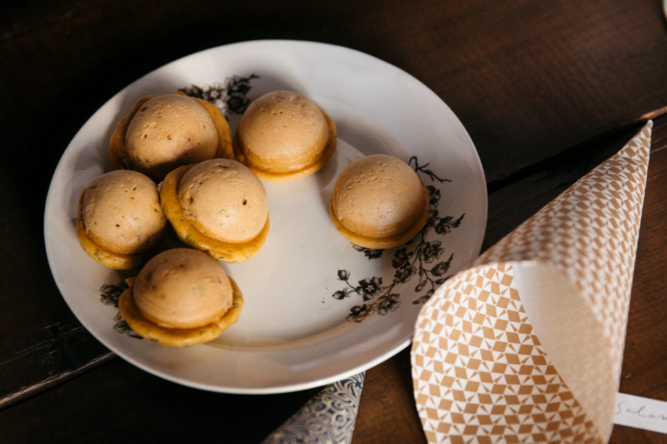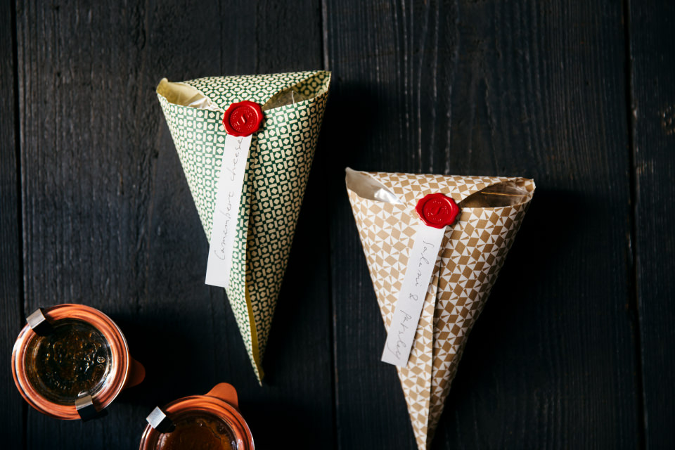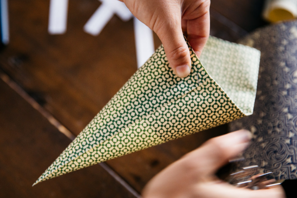 と、ここで伊東さんが取り出したのは、美しい柄のペーパー。これをくるっとクレープみたいに円すい形にしてホッチキスで止め、そこにPP袋に入れたスナックボウルをイン! 三角の部分を閉じて、封ろう風のシールで留めると、シックでこなれた印象に。「このままお皿にのせてもいいし、グラスに立てれば器代わりにもなります。この包み方、チョコレートやキャンディなどのお菓子や、ポテトフライみたいな細長いものも入るし、余ったものも持って帰りやすくて便利ですよ~」と伊東さん。ちなみに、使った紙はイタリア・フィレンツェの老舗『Carta Varese』のものだそう。「コシとハリがあるしっかりした紙のほうが包みやすいです。子どもが一緒の時はポップな柄でも可愛いですね!」