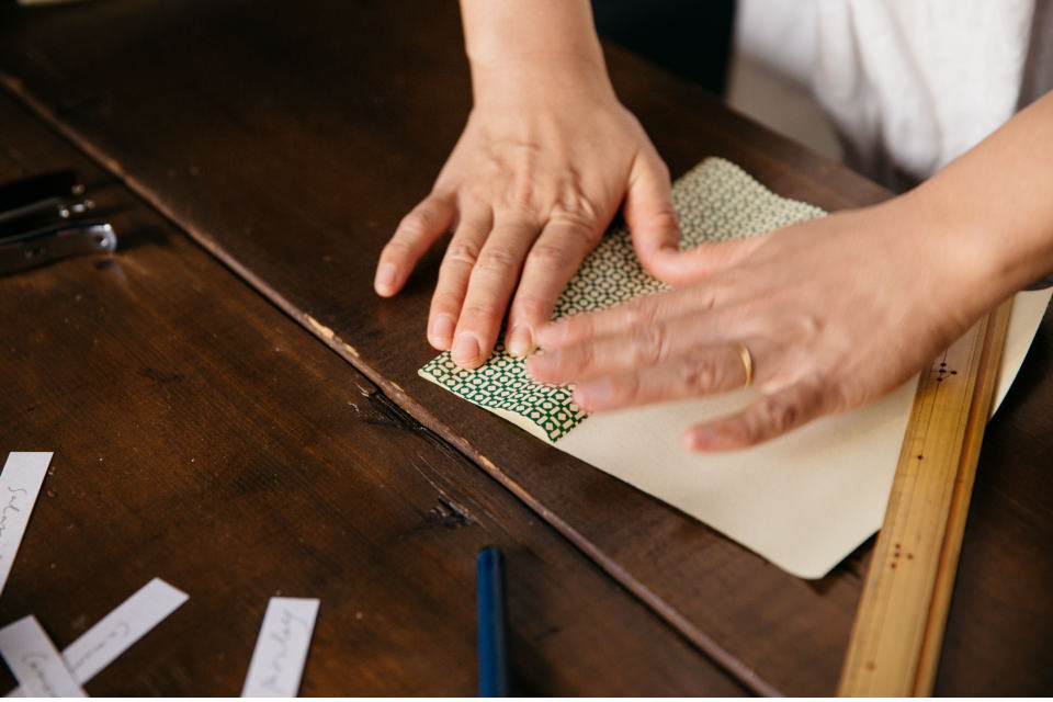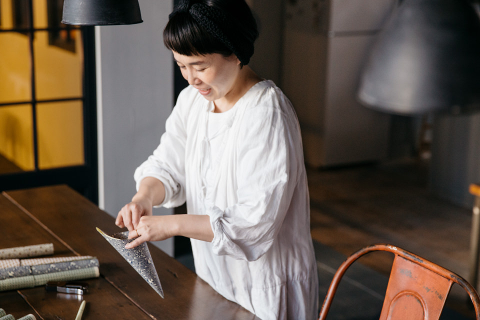 実は伊東さん、包む前にペーパーの端を少し折っていました。こうすると、紙をくるっと包んだ時にペーパーの裏の白い部分が隠れるのだそう。「柄が見えるのできれいだし、ラッピング自体もしっかりします。完全な自己満足ですが(笑)、ラッピングした感が出るんですよね」と伊東さん。シール留めする時に“サラミ”など中の味を書いて一緒に留めたり…と、ちょっとした気配りも素敵です。