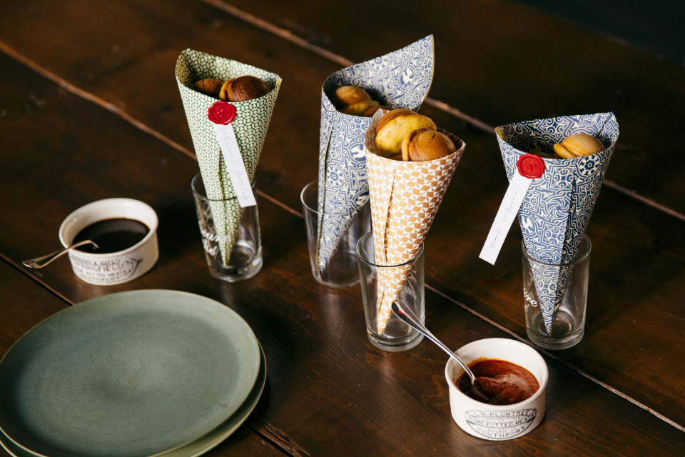 【持ち寄りその1】 一口サイズのスナックボウルは、シックなクレープ包みで