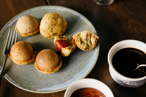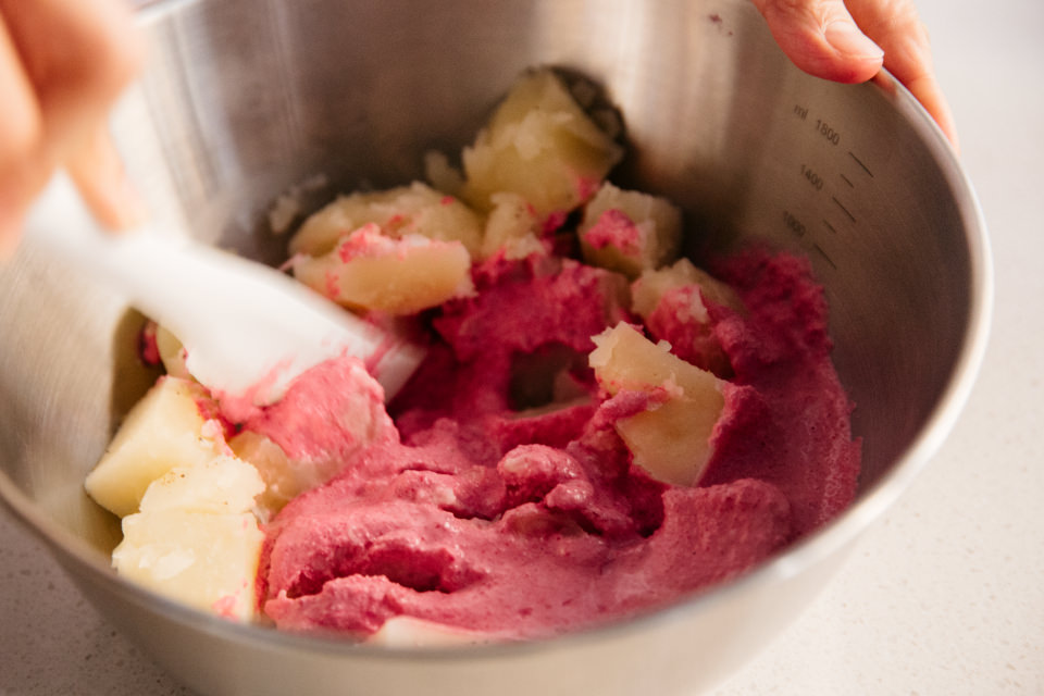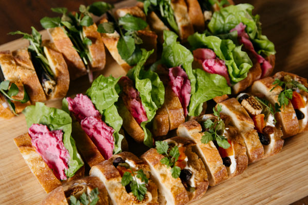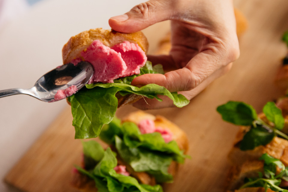 「ビーツを加えるだけで色がつくので、ただのポテサラもあか抜けますよね! 挟む食材の組み合わせは、甘味+酸味、脂っこいもの+爽やかなものなど、2つくらいの味を合わせるとまとまりやすいです」と村山さん。葉っぱはちょっと引き出してフリルみたいにしたり、ポテサラをスプーンの背にのせて2回塗りつけることで凹凸を作ったりして、見た目もGOOD! 村山さんの具の挟み方も素敵です。