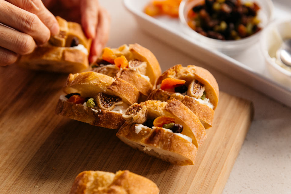 あるとテーブルが華やかになって、腹持ちもいい。2品目は、そんなおしゃれバゲットサンド。村山さんが教えてくれたのは、バゲットまるごと1本を使った、見た目も味も麗しい、3種類のサンド。塩味系の「オイルサーディン」、マイルド味の「ビーツのポテサラ」、甘い「ドライフルーツ&クリームチーズ」。しょっぱさと甘さの無限ループにはまりそうなラインナップです。サーディンと、ドライフルーツは火を使わず材料をはさむだけ。ビーツのピンク色がかわいいポテサラは[カプセルカッター キャトル]で作ります。