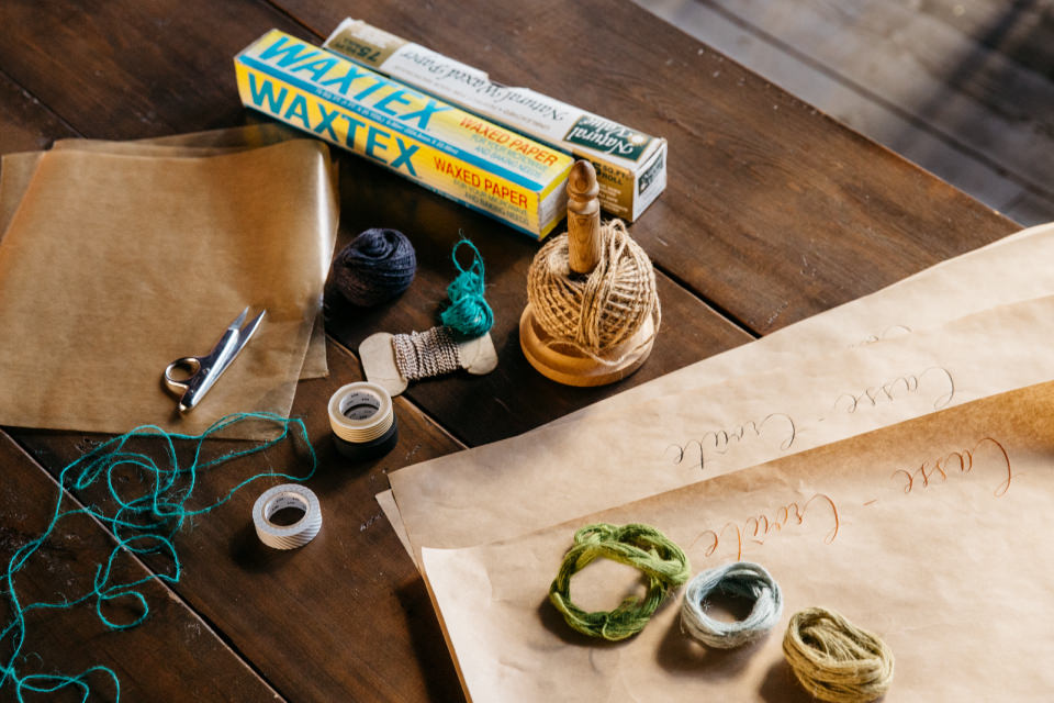 ❷①をクラフト紙に包んで両端をきゅっとねじり、ねじった部分を麻紐や毛糸などで結ぶ。