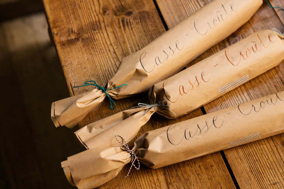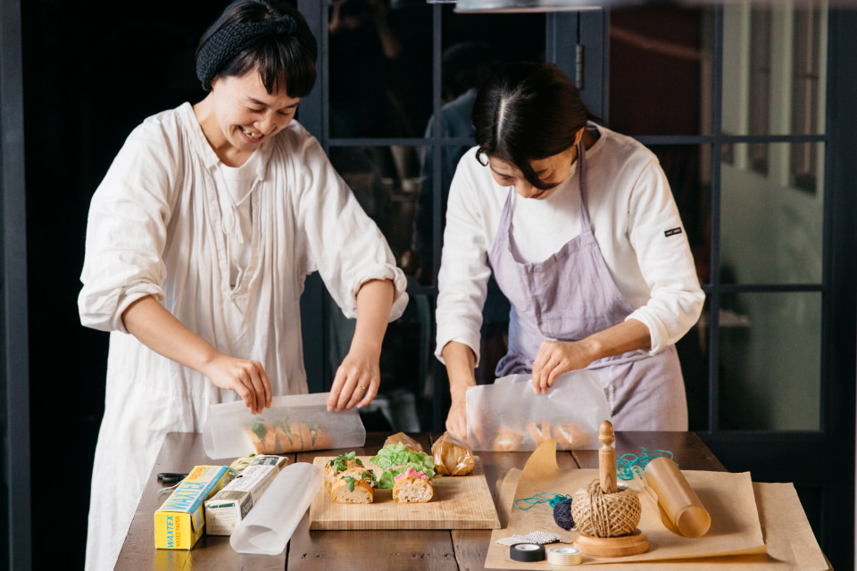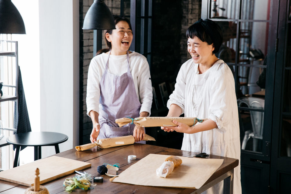 包む紙は、花屋さんが使っているようなハリのあるクラフト紙。クラフト紙には、中身を手書きしておくとひと味違ったラッピングになるそう。今回はカリグラフィーをしている伊東さんのご友人に書いていただいたそうです。まずは1個ずつカットしたバゲットサンドを3個ずつワックスペーパーで包んで、それをさらにクラフト紙で包みます。あとは両端を麻ひもや毛糸で結ぶだけ。テーブルに、この包みを広げて置くだけでも、こなれた雰囲気になりそうです。「包むのを失敗しても、紙のしわも味になるから大丈夫!」と伊東さん。村山さんとおしゃべりしながら包んでいると…「あれ?同じ量のバゲットを包んだのに、仕上がりサイズが違う!」とお互いの仕上がりを見て「性格とか、、出ますよね~」と大爆笑。